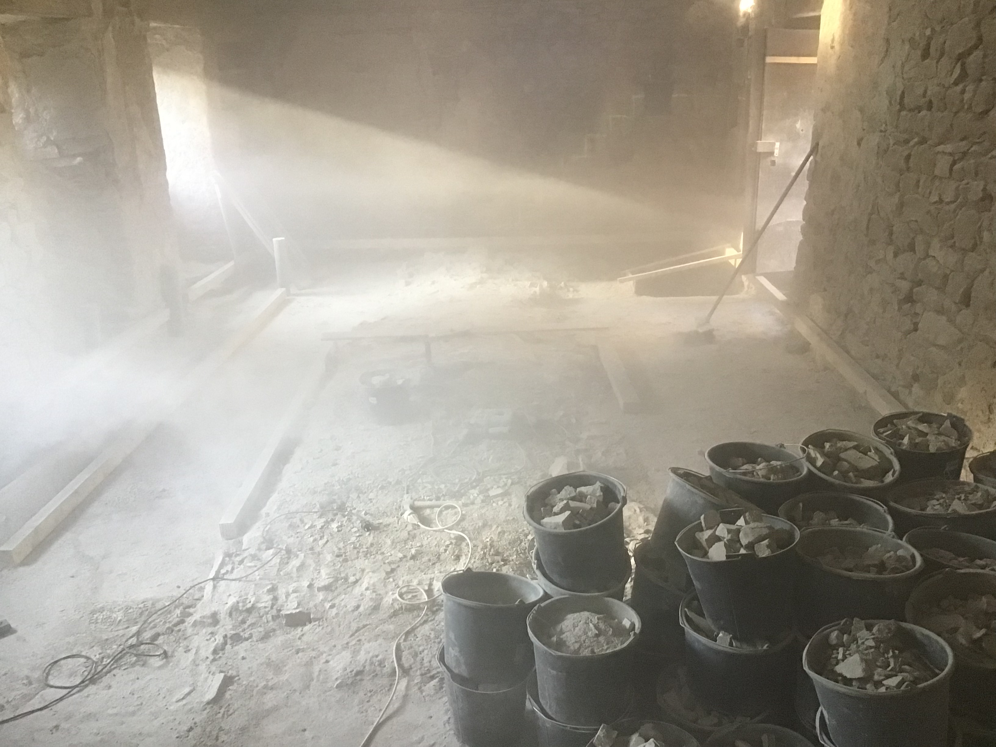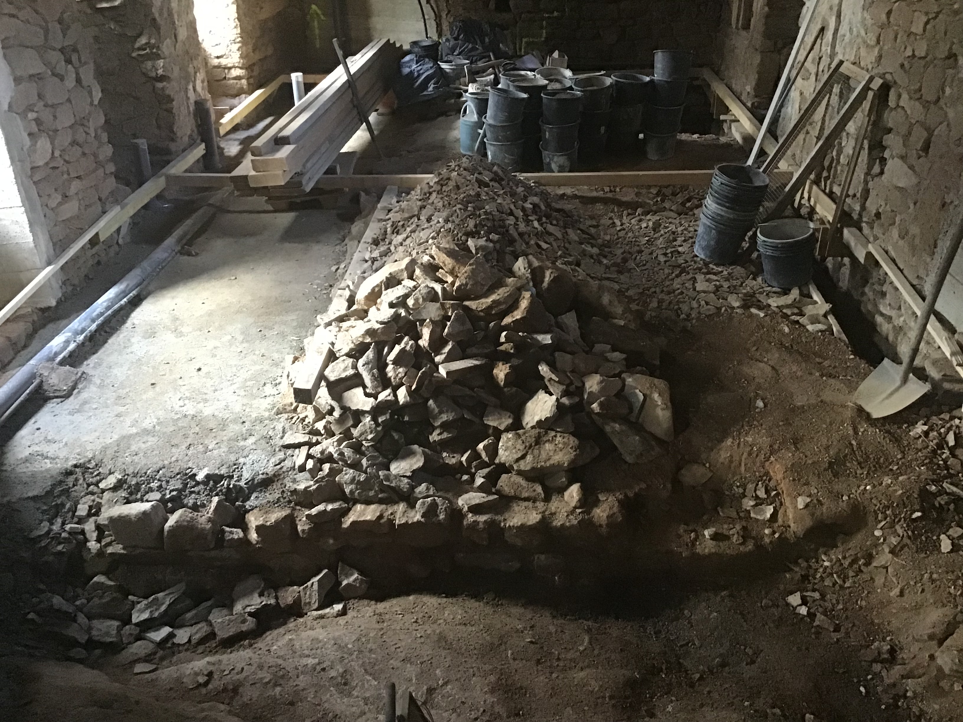 Man könnte meinen, es wäre ein Gemisch aus Bruchsteinen, mit Sand umfüllt. Aber dem ist nicht so. Man erkennt noch heute, dass die Steine der alten Trennmauer zwischen Wohnhaus und Stall vor allem bodennah nur mit Lehm verklebt wurden. Und so wurde auch der ganze Untergrund über dem Kellergewölbe aufgefüllt. Mit Bauschutt und lehmiger Erde vermischt.